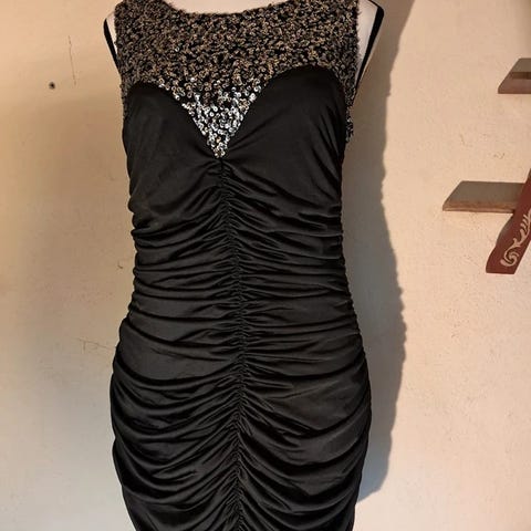 Audrey Boutique Fest/cocktail kjole i størrelse M, sort farve med hvidt broderi. Kjolen er designet til kvinder og egnet til festlige lejligheder.