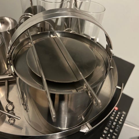 Stelton Cylinda Line barudstyr i rustfrit stål. Sættet inkluderer forskellige beholdere og tilbehør til barbrug, alle med et moderne og funktionelt design. Materialet er rustfrit stål, hvilket sikrer holdbarhed og nem rengøring.