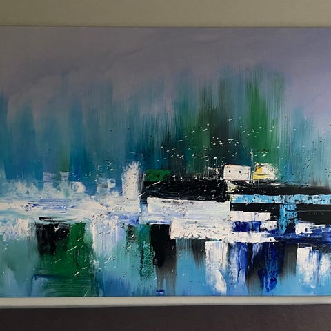 Abstrakt maleri udført med akrylmaling på lærred. Maleriet har en farverig og dynamisk komposition med forskellige nuancer og bevægelser. Kan bruges til dekorative formål i bolig eller kontor.
