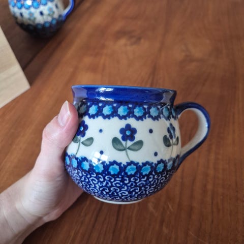 12 blå stentøjs-krus og tallerkener, nypris 720 kr. sælges for 225 kr. Tallerknerne er altså også mørkeblå, selv om farven er lysere på billedet.