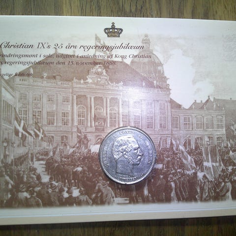Danmark, mønt i sølv, 2 DKK. Erindringsmønt i anledning af Kong Christian IX og Dronning Louises guldbryllup. Mønten er Ø 31 mm, Promillen er 800 og mønten vejer 15 gram. 26. Maj 1892.