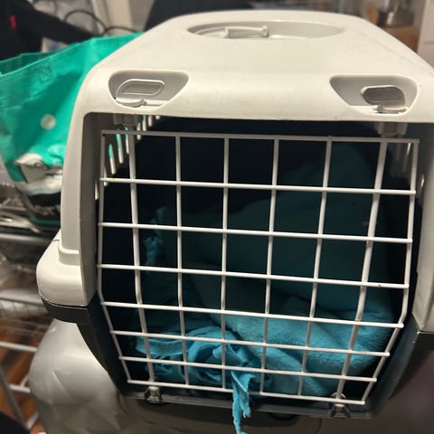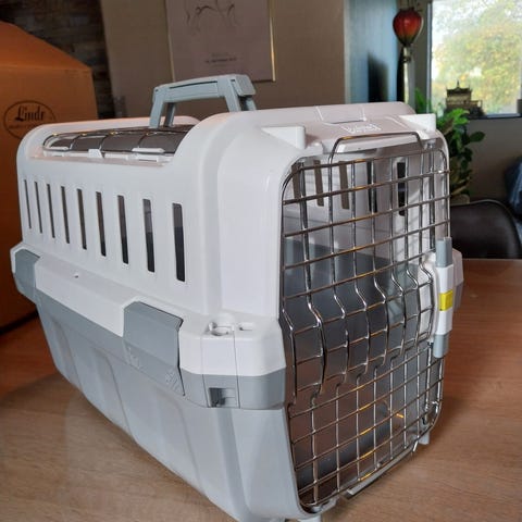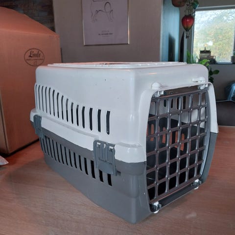 Transportkasse til katte i plast med metalgitter. Måler ca. 30 x 30 x 45 cm
