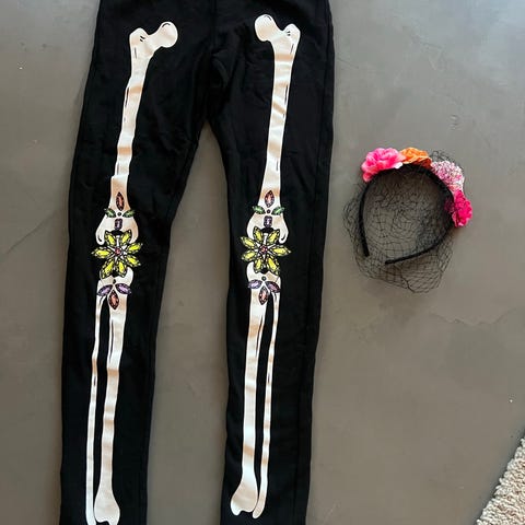 H&M Halloween kostume i størrelse 134 og 128 til piger. Kostumet er sort med skeletprint på overkroppen og arme samt lilla detaljer på nederdelen, der har et netlignende design. Materialet er blødt og egnet til børns brug ved udklædning.
