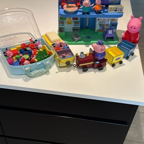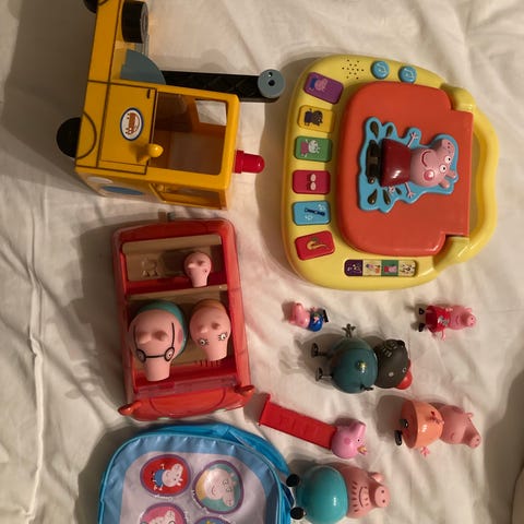 Masser af fint gurli gris legetøj, perfekt til pakkekalender, kan købes både seperat og samlet: isvogn, skole, butik = 40 kr stk, fly, autocamper, bil med picnic = 70 kr stk, alle dele samlet 300