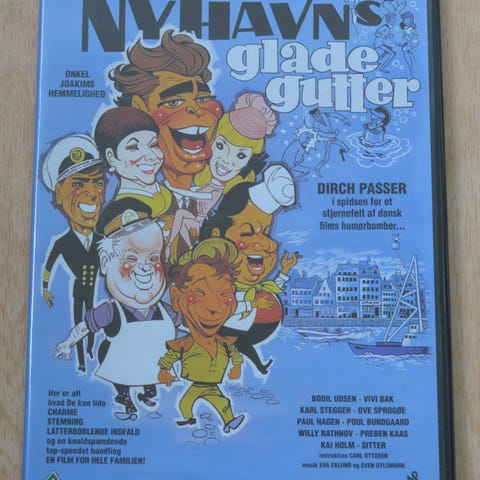 Dirch Passer Nyhavns glade gutter DVD med dansk tale. Filmen indeholder scener med karakterer i kostumer og er velegnet til familier. DVD'en har cover med illustrationer og fotos fra filmen.