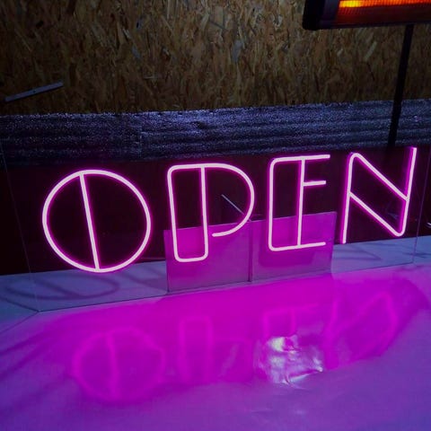 Welcome to the Good Life neon skilt i lilla farve. Skiltet er designet til indendørs brug og giver et dekorativt lys med teksten 'Welcome to the Good Life'. Det er velegnet til boligindretning eller som stemningslys i forskellige rum.