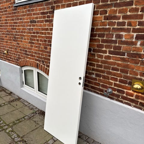 4 stk. Hvide lette inderdøre. Ikke massive. Standard mål med standardmål - bredde 82,5 højde 204 cm. Har en del brugsspor i maling/overflade men er fuldt funktionelle. Greb og nøgler medfølger. Dørkarme og halvdelen af beslag til karmen medfølger ikke. Døre med klassisk paneldesign og stålgreb.
