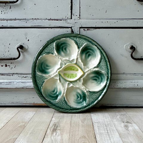 Fine opdelte tallerkener til østers og skaldyr, der er fremstillet i smuk fransk håndmalet fajance med plads til et halvt dusin (6 stk.) østers og citron i midten. Fra ca. 1950/60.
