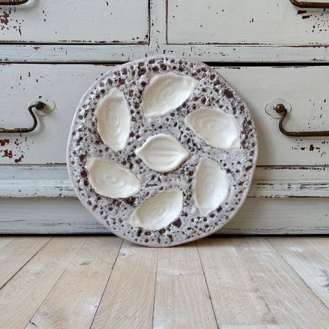 Smukkeste håndlavede østerstallerkener fra St Jean de Bretagne, der fremstår med den skønneste, håndmalede glasur i grønne og brunlige nuancer.