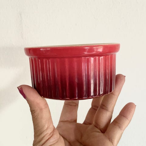 Ramekiner af keramik , ovnfast, brugt meget lidt , 6 stk , den ene med et lille skår ( se billede ) . Mål højde 4 cm , dia 8 cm . Samlet pris 55 kr .