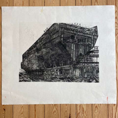Klassisk lækkert sort hvid litografi "Byggeplads" af Poul Skov Sørensen