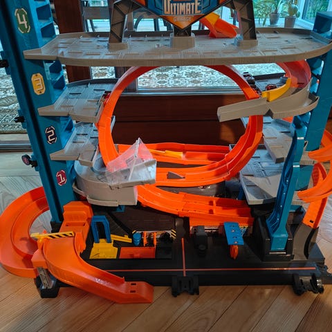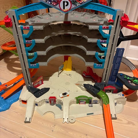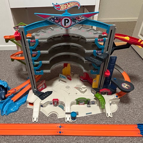 Hot Wheels City-legesættet være i stand til at parkere deres biler i en stor garage. Den byder på plads til op til 100 biler og en masse gadgets, såsom en racerbane og en elevator. Men børn skal passe på, for garagen gør også krav på en farlig T-Rex!