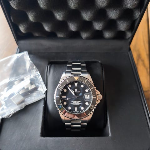 Købt for ca. 6 år siden, flere detaljer om uret findes her: https://www.steinhartwatches.de/en/ocean-39-gmt-blue-red-2.html