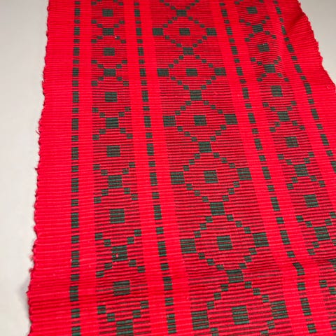 Jule bordløber i bomuld. Rød bund, gule engle hvide stjerner og julelys. Identisk mønster i begge ender. Måler 135c28cm og er i fin stand.Pris kr 40