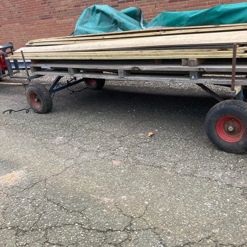 Vintage trækasse vogn med træbund og metalramme. Vognen har fire hjul og et håndtag til at trække eller skubbe. Velegnet til transport af tunge eller store genstande. Materialer inkluderer træ og metal, og den har et robust og industrielt design.