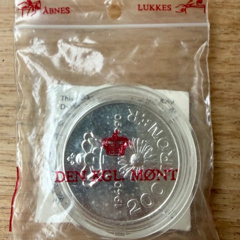 Danmarks Mønt Dronning Margrethe 200 Krone sølvmønt udstedt til minde om Dronning Margrethes 50 års fødselsdag den 16. april 1990. Mønten er udført af medaljeren Jan Petersen og har en diameter på 38 mm og en vægt på 31,1 g.