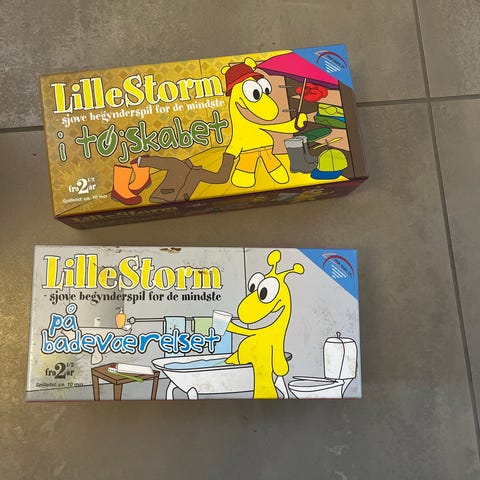 Lille Storm Miljøvenligt Børnespil til børn fra 2 år og op. Spillet indeholder forskellige brikker og kort med illustrationer af regntøj, paraplyer og andre vejrrelaterede elementer. Materialet er børnevenligt og designet til at lære børn om miljø og vejr på en enkel måde.