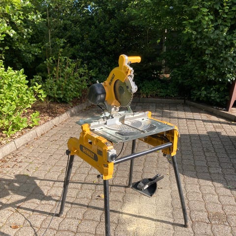 Professionel afkorter og flækkesav sælges, inkl to rulleborde, samt diverse tilbehør.