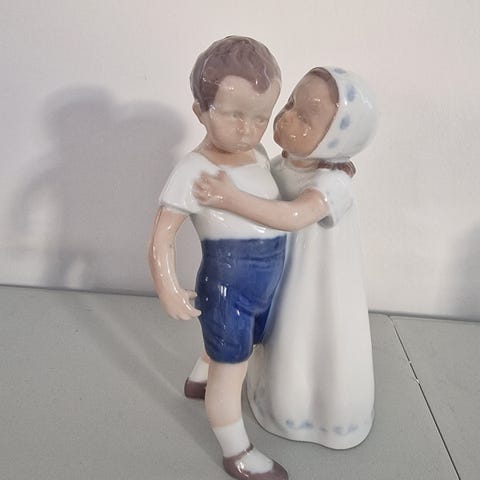 Bing & Grøndahl porcelænsfigur forestillende to børn, hvor den ene krammer den anden. Figuren er detaljeret med blå og hvide farver og fremstillet i glaseret porcelæn. Undersiden er mærket med Bing & Grøndahl logo og serienummer 1614.