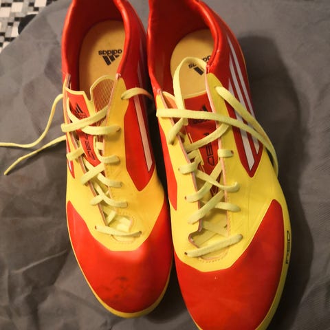 Adidas F50 fodboldstøvler i hvid og guld farve. Støvlerne er størrelse 38 og fremstillet i letvægtsmateriale. Designet til fodboldspil med knopper under sålen for bedre greb på banen.
