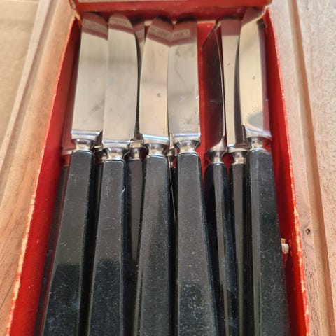 Middagsknive med ben håndtag. Virkelig god som steak kniv da den kan slibes op på strygestål inden servering.