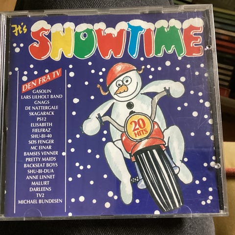 Snowtime Various Artists Musik CD med 20 hits. Indeholder sange fra forskellige kunstnere. CD'en har et vintertema med illustrationer af en sne-mand på motorcykel. Musikgenrer og specifikke sange varierer, velegnet til lytning i vinter- og juletiden.