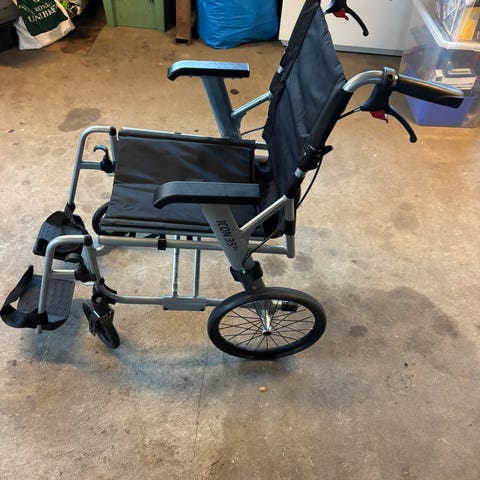 Meget fin og velholdt køre stol med lækker komfort sæde og lomme i ryggen til drikkedunk og andre ting,og pungterfri dæk, meget let at bære kan nemt ligge i en Citroen C 1 .