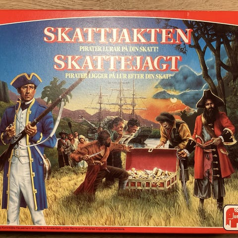 Jumbo Skattejagten brætspil med pirater. Indeholder spilleregler på flere sprog og illustrasjoner af pirater og skip. Brætspillet er designet for underholdning og strategisk spill, egnet for flere spillere.