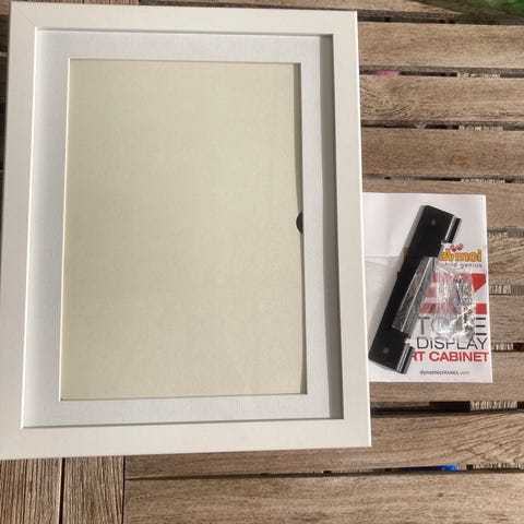 Du kan åbne rammen og sætte nye tegninger oven på de gamle (mens rammen hænger på væggen). Virkelig pæn stand, men har et lille hak på det ene hjørne.