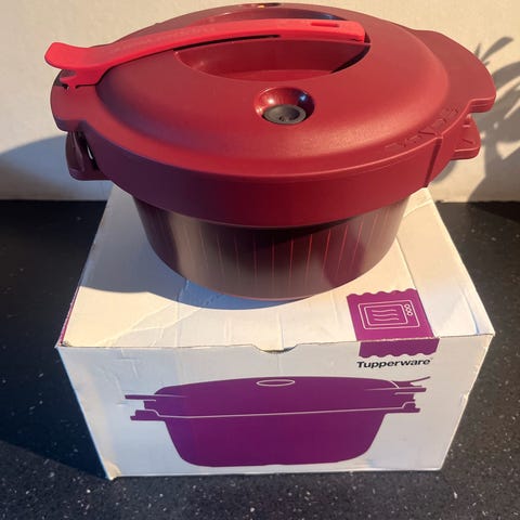 Fejler intet! Denne genstand er en Tupperware MicroWave Fast Cooker, også kendt som en trykkoger til mikrobølgeovn. Den er designet til at tilberede mad hurtigt i mikrobølgeovnen ved at skabe et tryk inde i beholderen, hvilket reducerer tilberedningstiden.