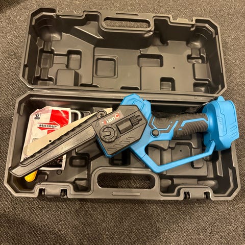 Black+Decker 18V Lithium batteridrevet kædesav med en savklinge designet til lettere træarbejde. Udstyret med et 18V lithiumbatteri, der giver trådløs betjening og mobilitet. Passer til have- og mindre træskæringsopgaver.