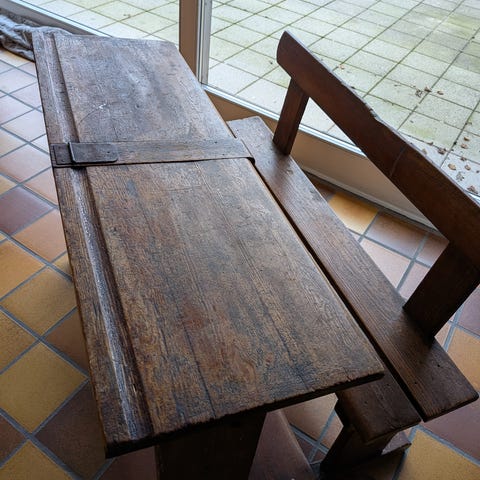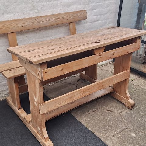 Gammelt skolebord fra en skole. Der har ikke været skuffer til men tingene fra skoletiden blev lagt derind.