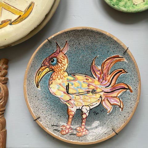Smukt kunst keramikfad med håndmalet fuglemotiv 28 cm Ø