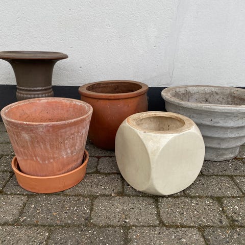 Lerpotter med drænhul. Ca. Ø10cm. Pr./stk.: 10kr.