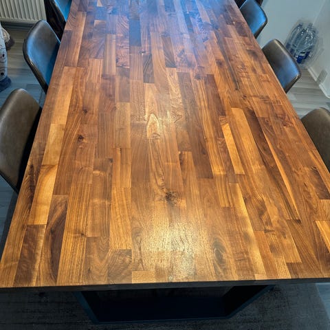 Spisebord med massiv træbordplade og sorte metalben. Bordpladen måler 200 cm i længden og 80 cm i bredden. Bordet har enkelte brugsspor, alle brugsspor er dokumenteret med billede. Designet er enkelt og funktionelt, egnet til spisestue eller køkken.