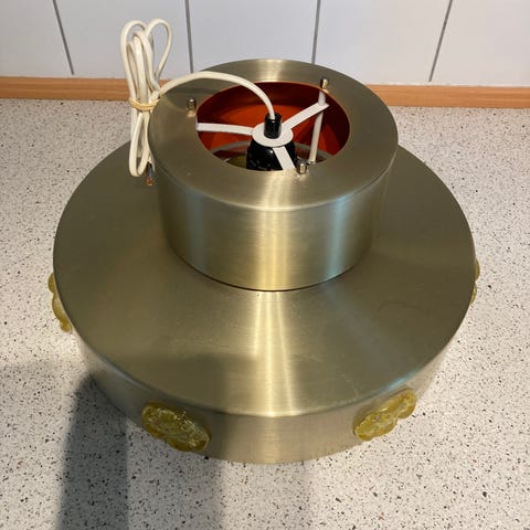 Den har brugspatina, glasset er uden revner, har lidt ujævnheder ved glas kanten, ingen buler. Mål: ca. diameter ca 33 cm – højde ca 22 cm. Leveres m. 3 meter ny hvid ledning.