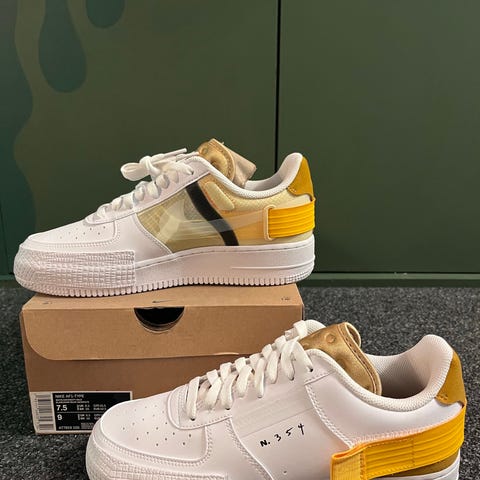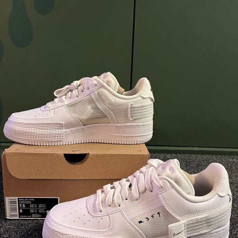 Nike Sneakers i størrelse 43. Skoene er hvide med sorte detaljer og har en høj ankelstøtte. Materialet er primært læder med en gummisål. Designet er unisex og egnet til daglig brug.