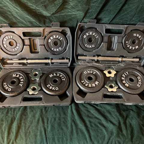 Praktisk håndvægtsæt i solid plastkuffert med alt, hvad du skal bruge til styrketræning derhjemme.