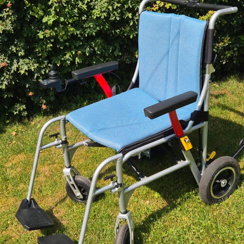 NEDSAT El-scooter Elektrisk Kørestol med sort polstring. Kørestolen rygstøtte, fodstøtter og armlæn, samt et joystick til styring. Designet til indendørs og udendørs brug med fire hjul for stabilitet. Nypris Sep 24 19995r, kvittering haves