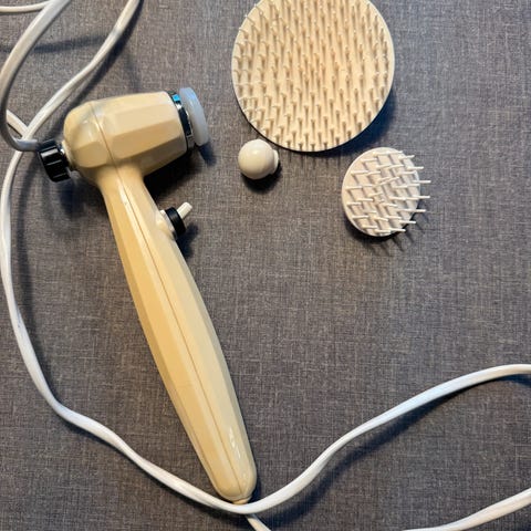 Intra Original er et vintage massageapparat, der blev brugt til at massere ansigtet og kæben. Apparatet, der er vist i en rød kasse, har forskellige indstillinger og en håndholdt enhed til at udføre massagen.