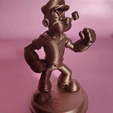 Figuren viser den klassiske sømand Popeye the Sailor siddende i en farverig rød/gul båd.