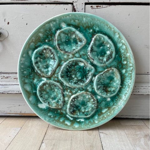 Fine opdelte tallerkener til østers og skaldyr, der er fremstillet i smuk fransk håndmalet fajance med plads til et halvt dusin (6 stk.) østers og citron i midten. Fra ca. 1970