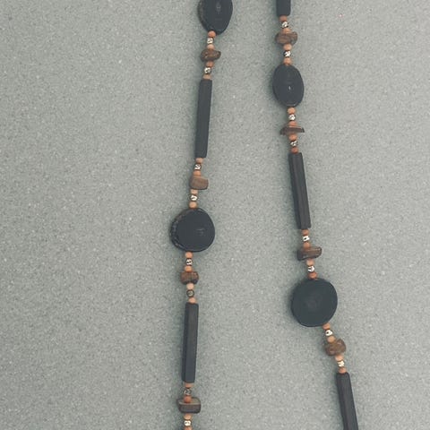 Amber necklace composed of natural stone beads in varying shades of amber color. The necklace features irregularly shaped beads strung together, suitable for casual or formal wear.