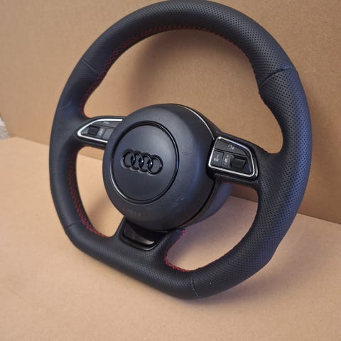 Fladbundet læderrat til Audi A3 8V, A4 B9 8W, A5 F5 og andre modeller fra 2016 til 2023. Helt nyt med hvide syninger, med plads til gearskift.