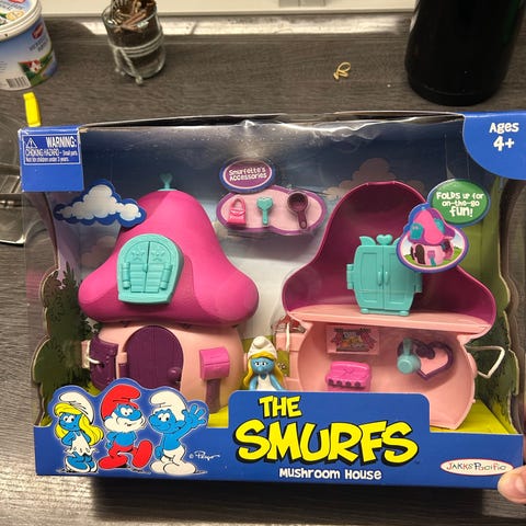 The Smurfs Mushroom House legetøj med gul hat og brun dør. Indeholder små figurer og tilbehør til leg. Fremstillet i plastik med detaljer i forskellige farver. Egnet til børn fra 4 år og opefter. Kan foldes sammen for nem opbevaring og transport.