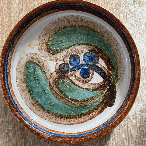 Søholm keramik skål med blomsterdekor, lavet i brune og beige nuancer. Skålen har en rund form med en bred kant og er dekoreret med håndmalede blomster. Bunden er mærket med Bornholmsk keramik Søholm. Skålen kan bruges som dekorativt element eller til opbevaring.