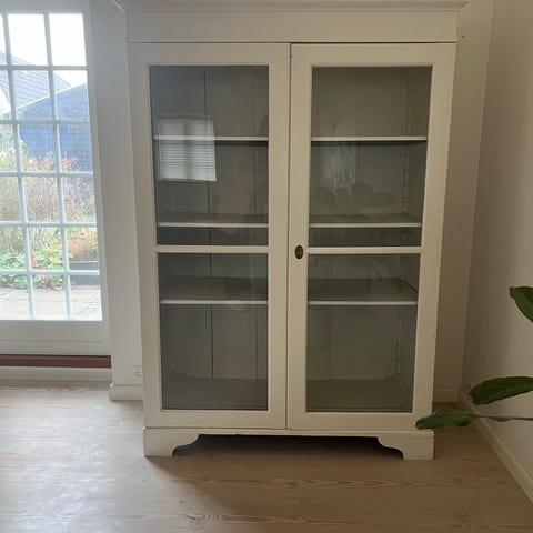 Vitrineskab. Massiv træ. Nymalet både udvendig og indvendig. Interiør maling glans 40. Højde: 219 cm. Bredde: 204 cm. Dybde: 53 cm. Kan deles mellem skænk og overdel ved transport. Strømtilslutning bag på, lige til at tilslutte stikkontakt. Skabet har hverken skader eller mangler. Pris: 4600 kr. Kan ses / afhentes i 6600 Vejen eller leveres mod betaling, i Jylland eller på Fyn.