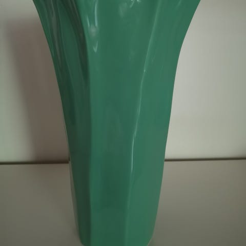 Royal Copenhagen vase i keramik med hvid glasur, guldkant og grønne detaljer. Vasen har et unikt krakeleret mønster og måler ca. 19 cm i højden. Den er velegnet til dekorative formål og som en del af en samling af porcelæn.