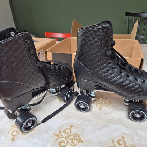 spiritblade rulleskøjter lady str 26. Det svarer til ca. str. 40. På billedet ser de medtaget ud, men det er fordi jeg ikke har gjort dem ren efter opbevaring i kælderen i en rum tid. Det er bare støv, der dækker dem. De er dog af ældre dato, og jeg ved ikke, hvordan hjulene har klaret tidens tand. Derfor er de gratis.