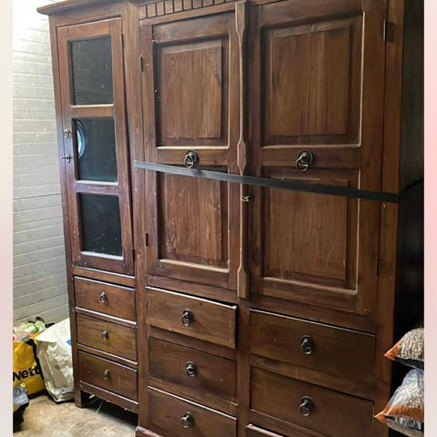 Skabet har en træoverflade med glasdøre. Det fremstår elegant og robust. Passer til konsolbord der er lavet klar til at der kan etableres lys.,Afhentes i:,Røde Kors Aabenraa (546),Bemærk at mail, chat og beskeder ikke besvares, og varen skal købes på knappen "Gå til varen"